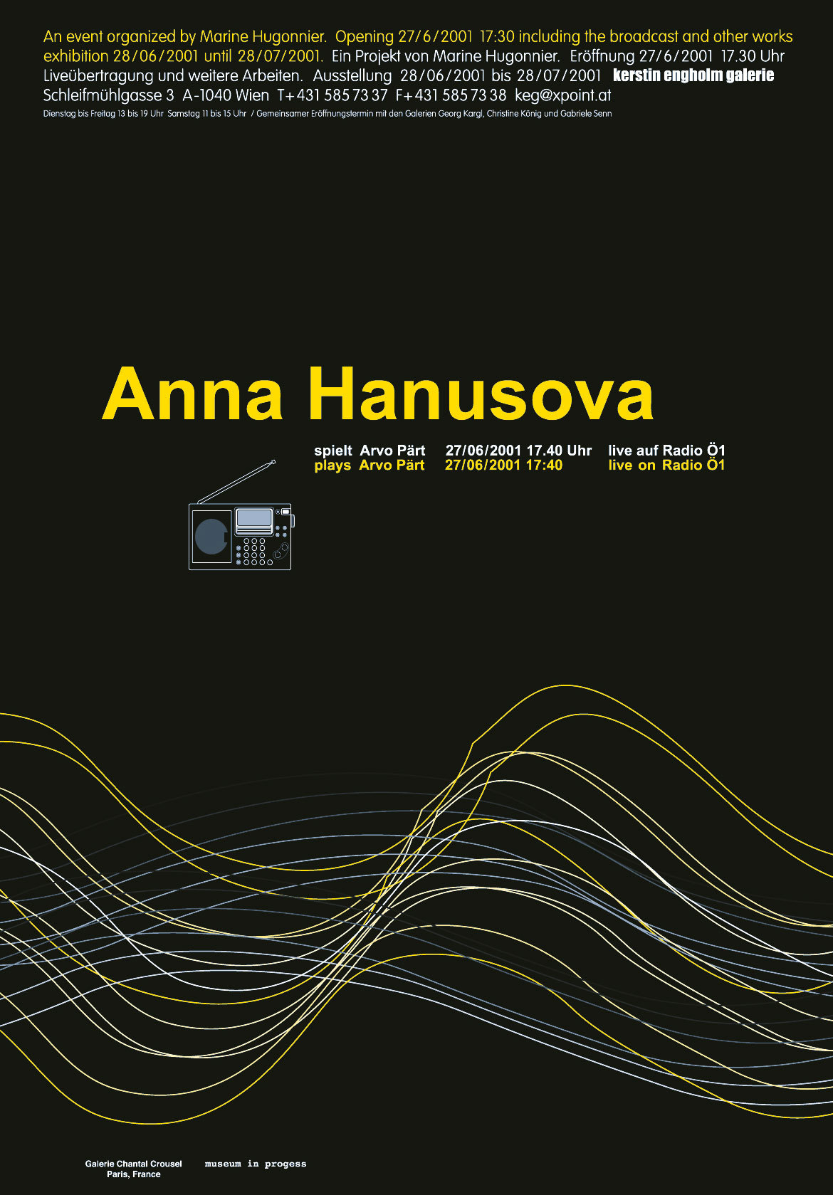 In 1943 Anna Hanusova made it out of Teresin camp as part of music trio ‘Trio Room 28’. In June 2001 she was invited to play a piano piece, that would be broadcasted live and nationwide on the Austrian national radio, the radio ö1. The broadcast took place at 5:40pm on the June 27th 2001. Anna Hanusova performed a piano piece of her choice : Für Alina by Arvo Part. During the live broadcast a short film was made at the radio station. This work was made for Camera Austria‘s issue published in response to the Austrian’s October 1999 election and the rise of the extreme right.