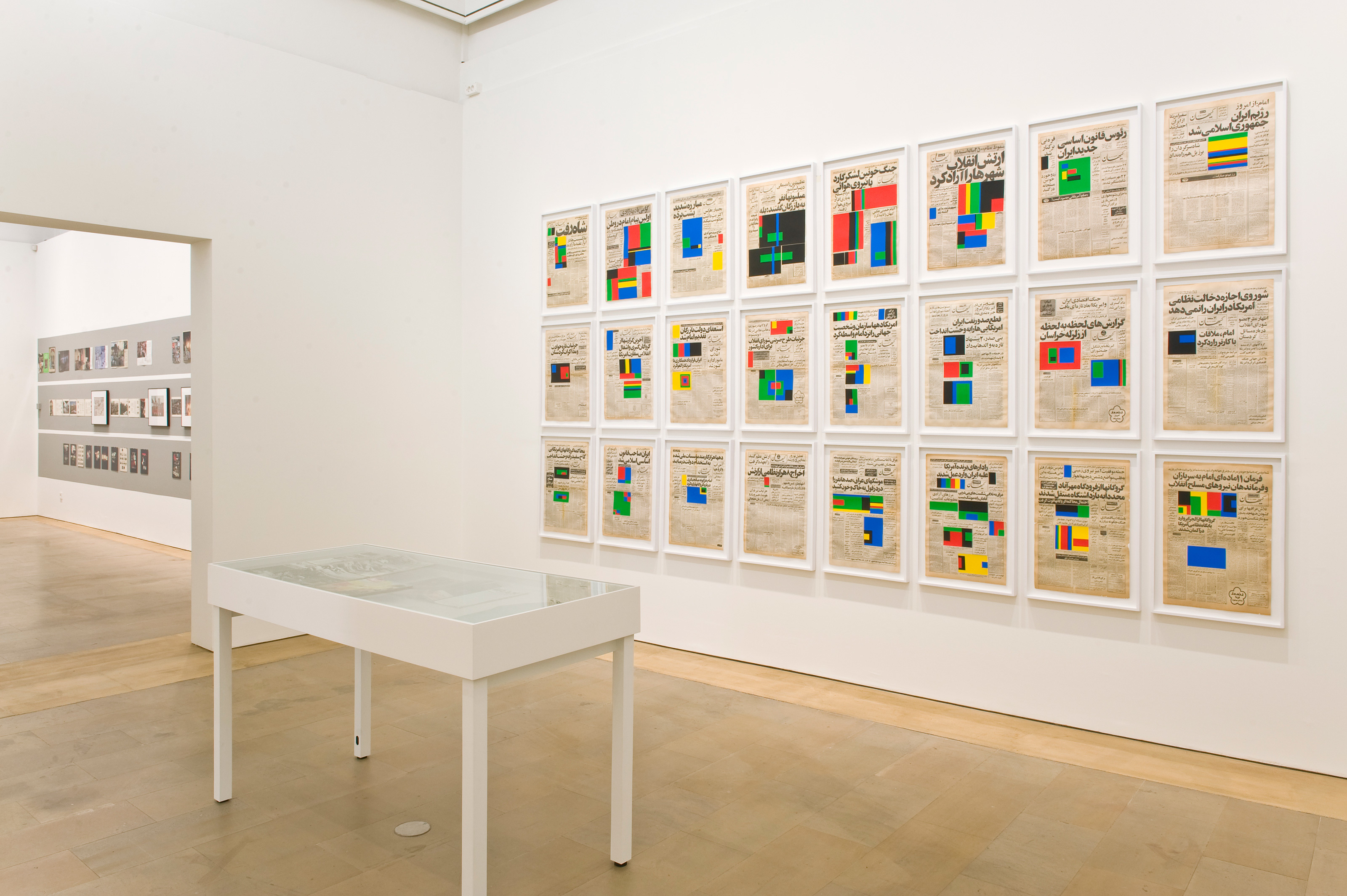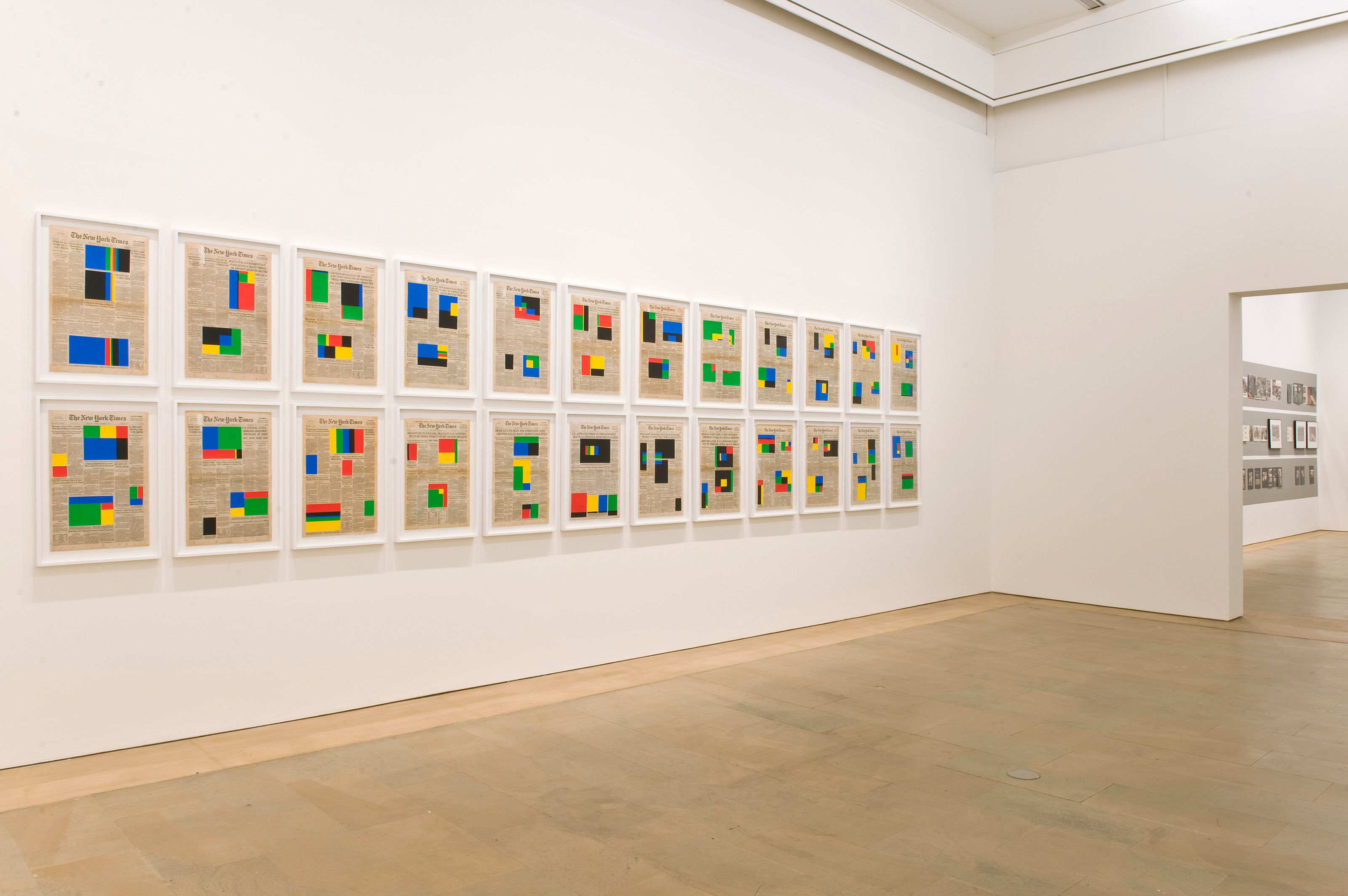 Art for Modern Architecture is a series of collages on vintage newspapers featuring silkscreened coloured blocks covering all images of the front pages. The colours are the ones from the Standard Kodak Colour Chart. This principle of “coverage” investigates the reality of the spectator’s memory, whether it is a cultural ground, a collective consciousness or an imaginary landscape.