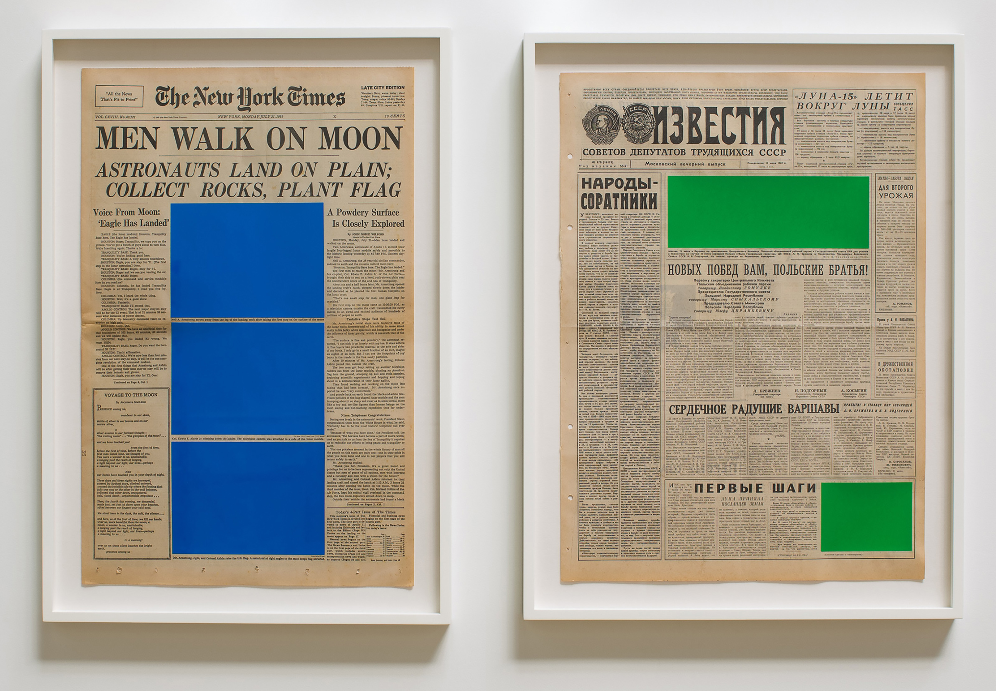 Art for Modern Architecture is a series of collages on vintage newspapers featuring silkscreened coloured blocks covering all images of the front page. The colours are the ones from the Standard Kodak Colour Chart. This principle of “coverage” investigates the reality of the spectator’s memory, whether it is a cultural ground, a collective consciousness or an imaginary landscape.